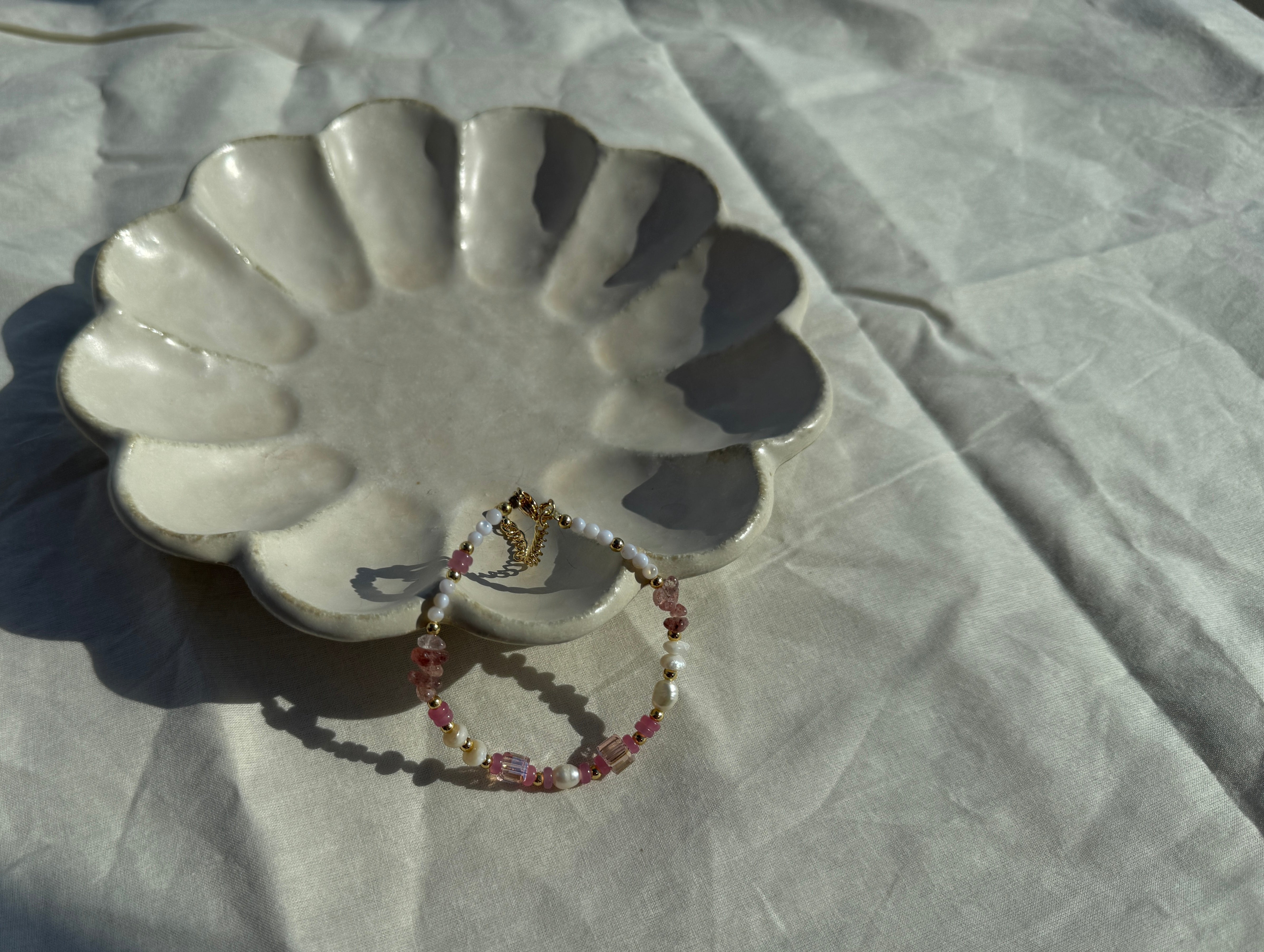 Crystal bracelet with berry-pink crystal beads and soft pearl accents. Minimalist piece made for stacking.