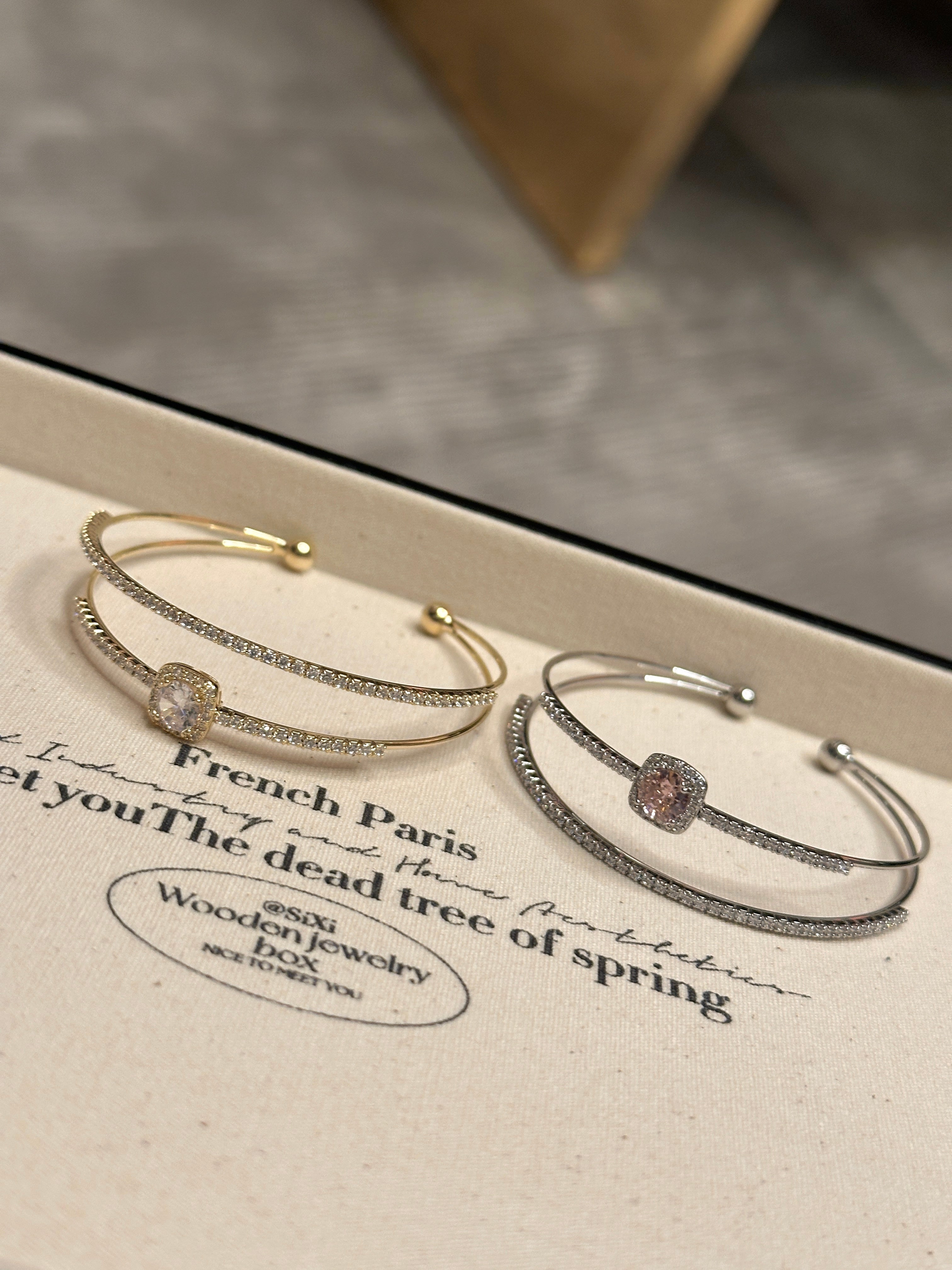A refined open cuff bracelet with a dual-band pavé design and a cushion-cut center stone that glows with soft brilliance. Available in two tones: Gold (18K plated on brass) and Silver (18K plated on stainless steel). Designed for everyday wear with a sleek, sculptural finish.