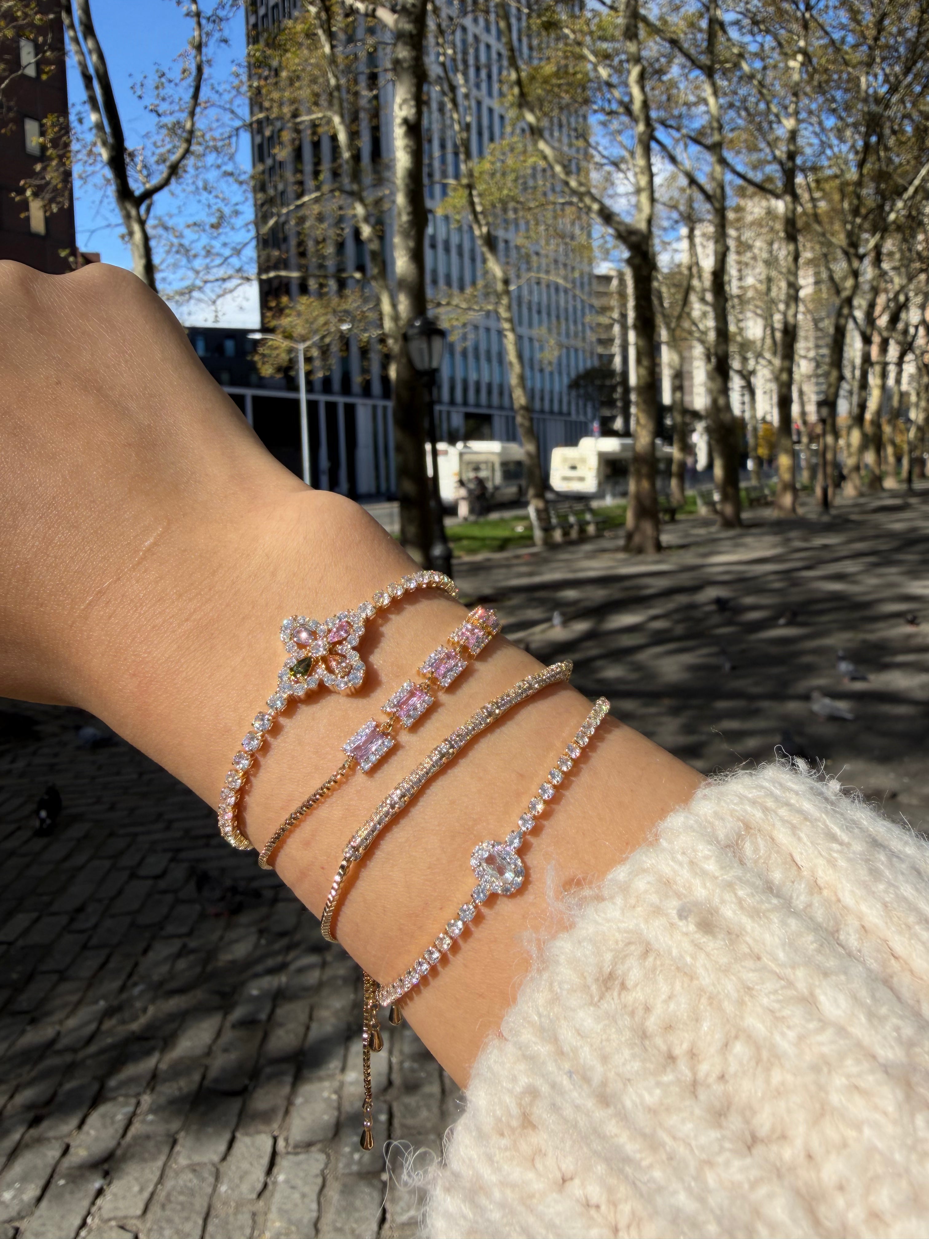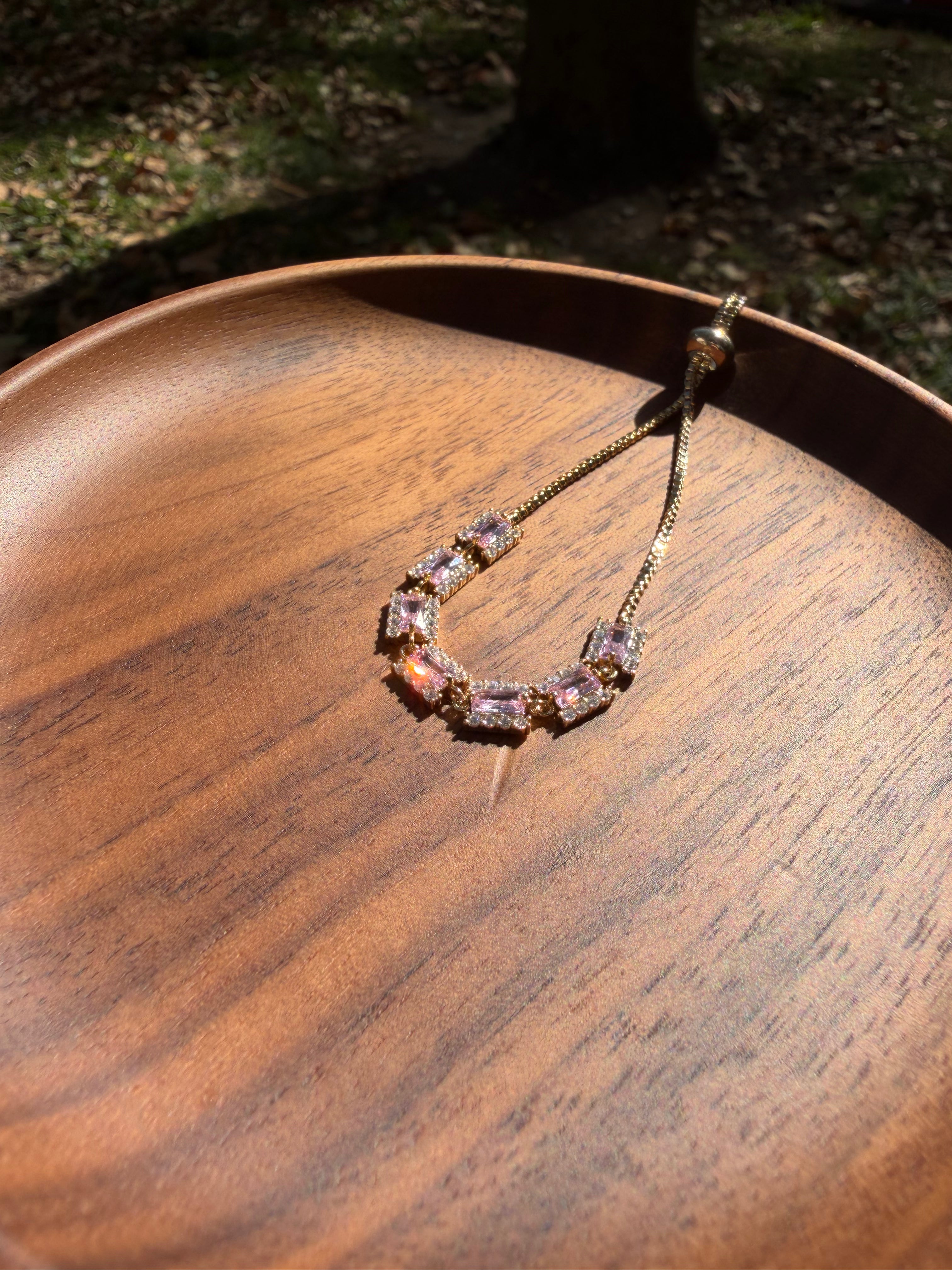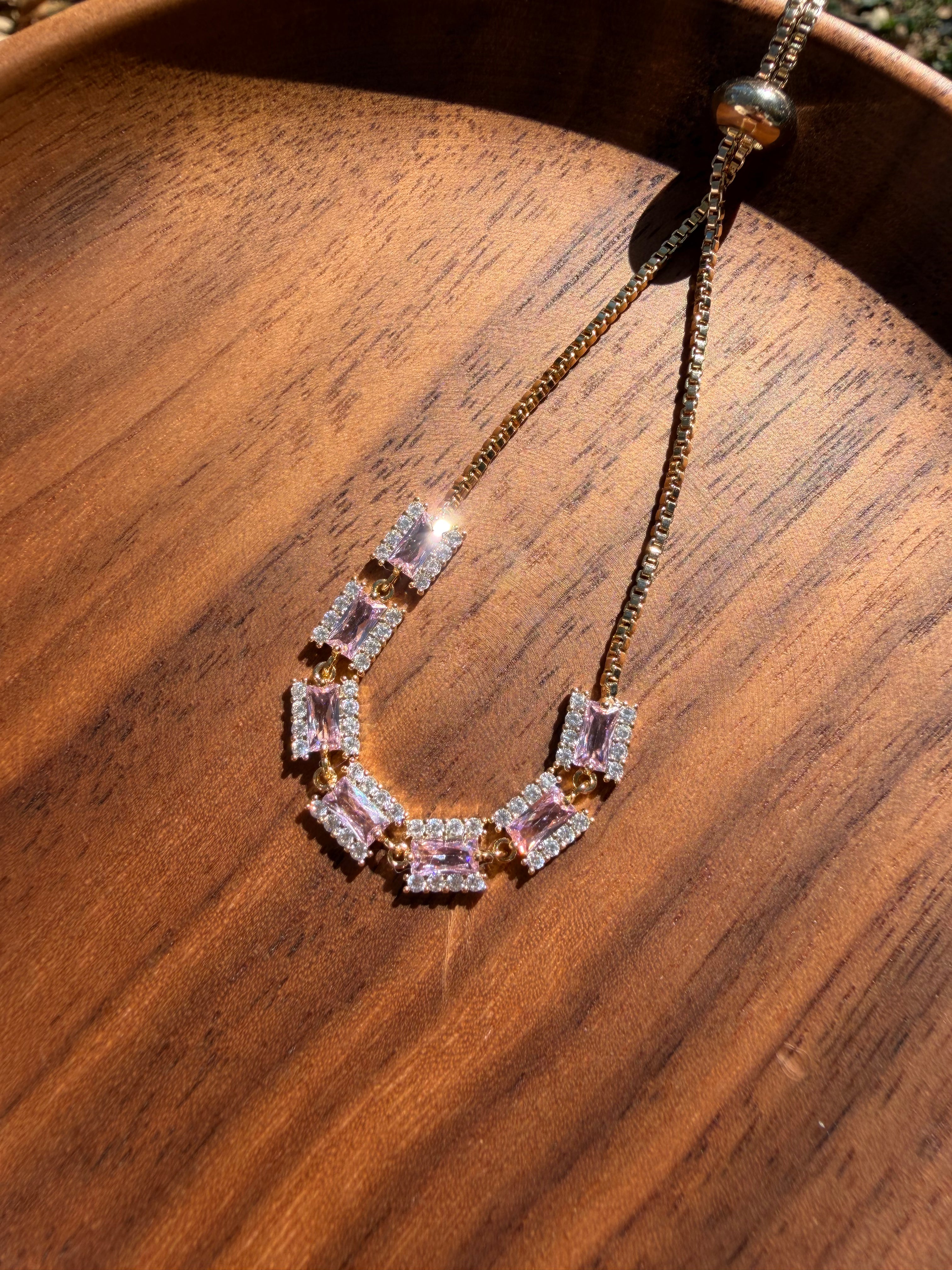 The Petal Edge Bracelet brings soft color and structured sparkle together. Featuring blush-pink rectangular stones framed with clear pavé crystals on a polished 18K gold plated chain. The sliding clasp allows for a custom fit and easy layering, adding a refined glow to any look.